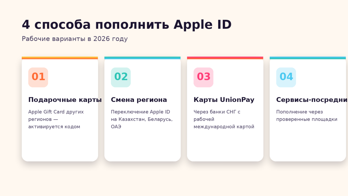 Пополнить Apple ID в 2026 году реально, хоть и чуть дольше, чем раньше. Самый быстрый путь — подарочная карта, самый стабильный — карта банка СНГ, самый удобный «на один раз» — проверенный сервис-посредник. Любой из вариантов работает, если следовать базовым правилам: покупать у надёжных продавцов, не путать регионы и никогда не передавать пароль от аккаунта.