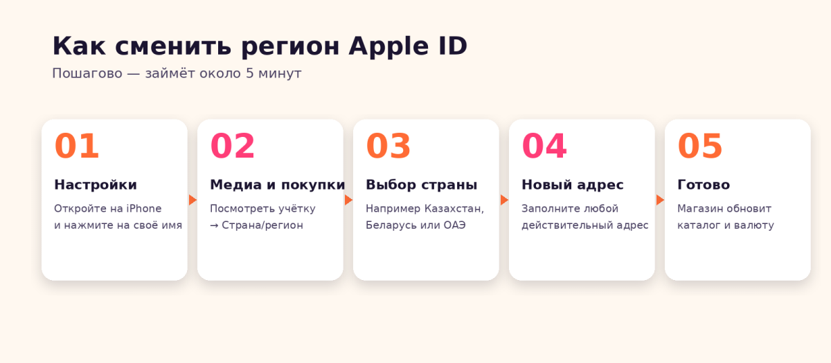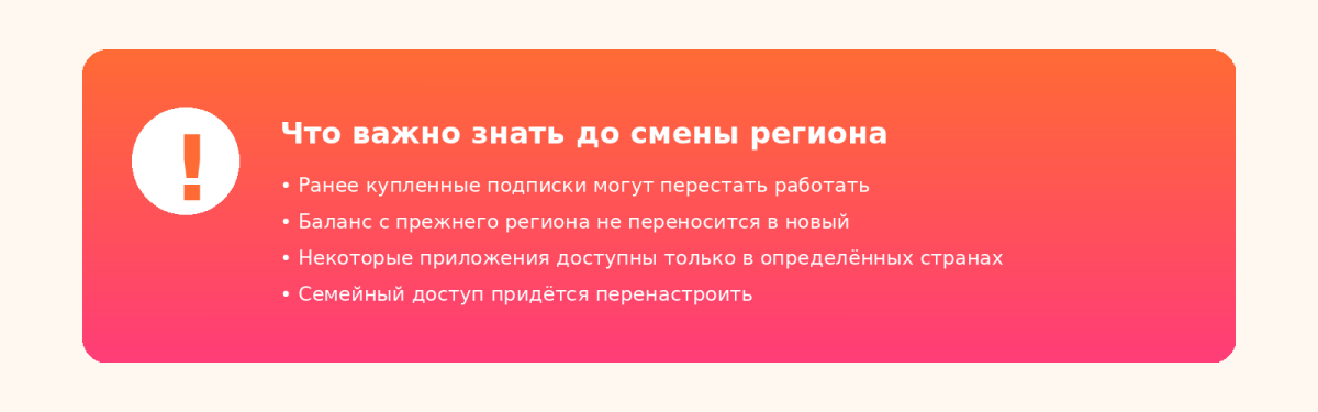Смена региона Apple ID | 10–15 минут | Средняя | Потеря части подписок и баланса |